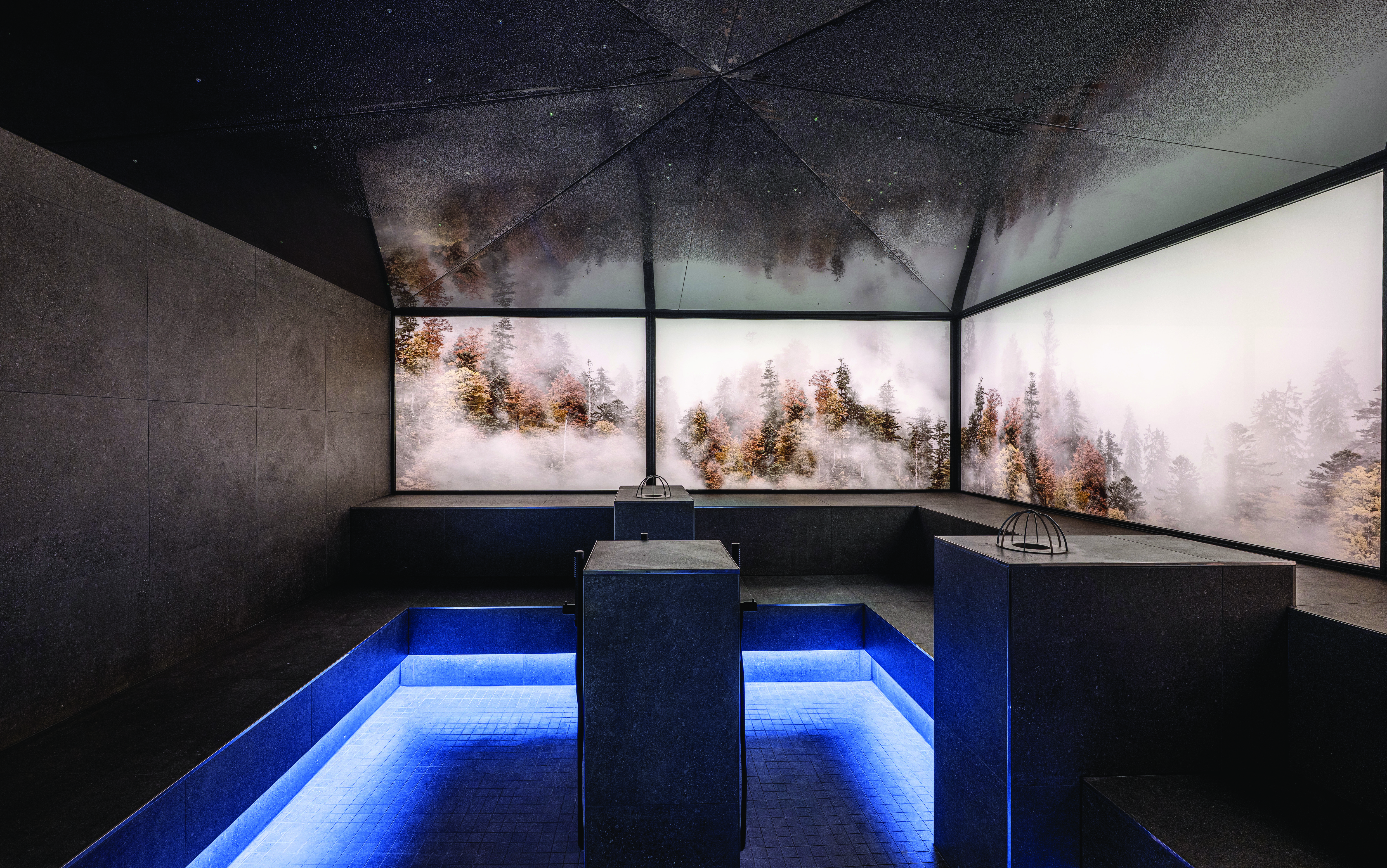 In the design of the baths, colors and materials form a cohesive whole that is closely aligned with the atmosphere of the surrounding natural environment. The landscape characteristics of the Allgäu region are translated into a spatial concept that runs through the entire building. The idea of the four elements serves as a leitmotif, reflected in the distinct material and color schemes of the various functional areas.
