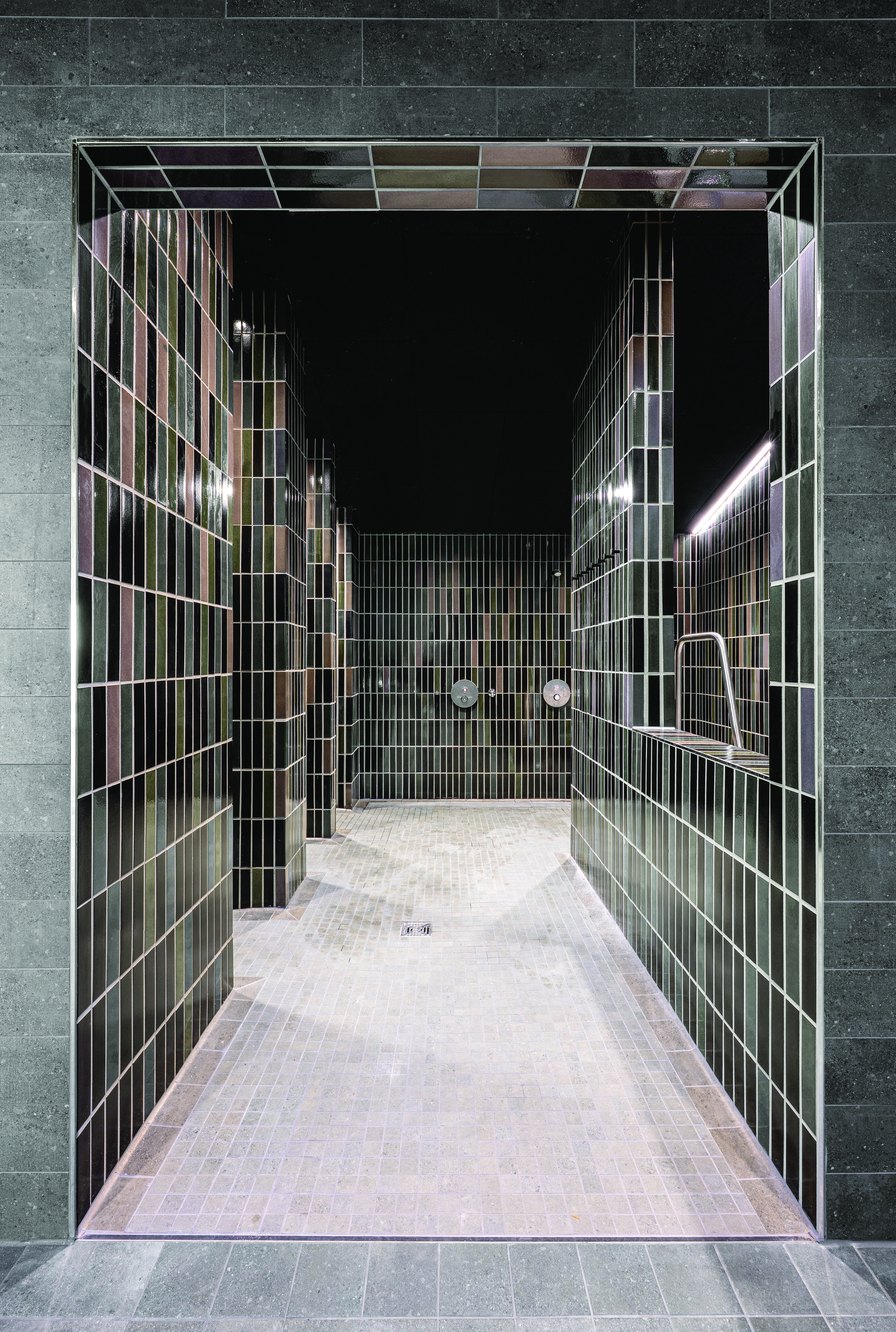 Another design focus lies in the cooling area of the sauna wing on the upper floor. Here, the design draws inspiration from the impressive atmosphere of the Breitach Gorge. The color palette of the cladding tiles from the Craft series – including flamed olive, benite blue, dark grey and hematite black – echoes the rugged rock formations, the subdued light and the cool freshness of the gorge. The slightly mystical effect of these shades simultaneously enhances the perceived cooling atmosphere of the space.