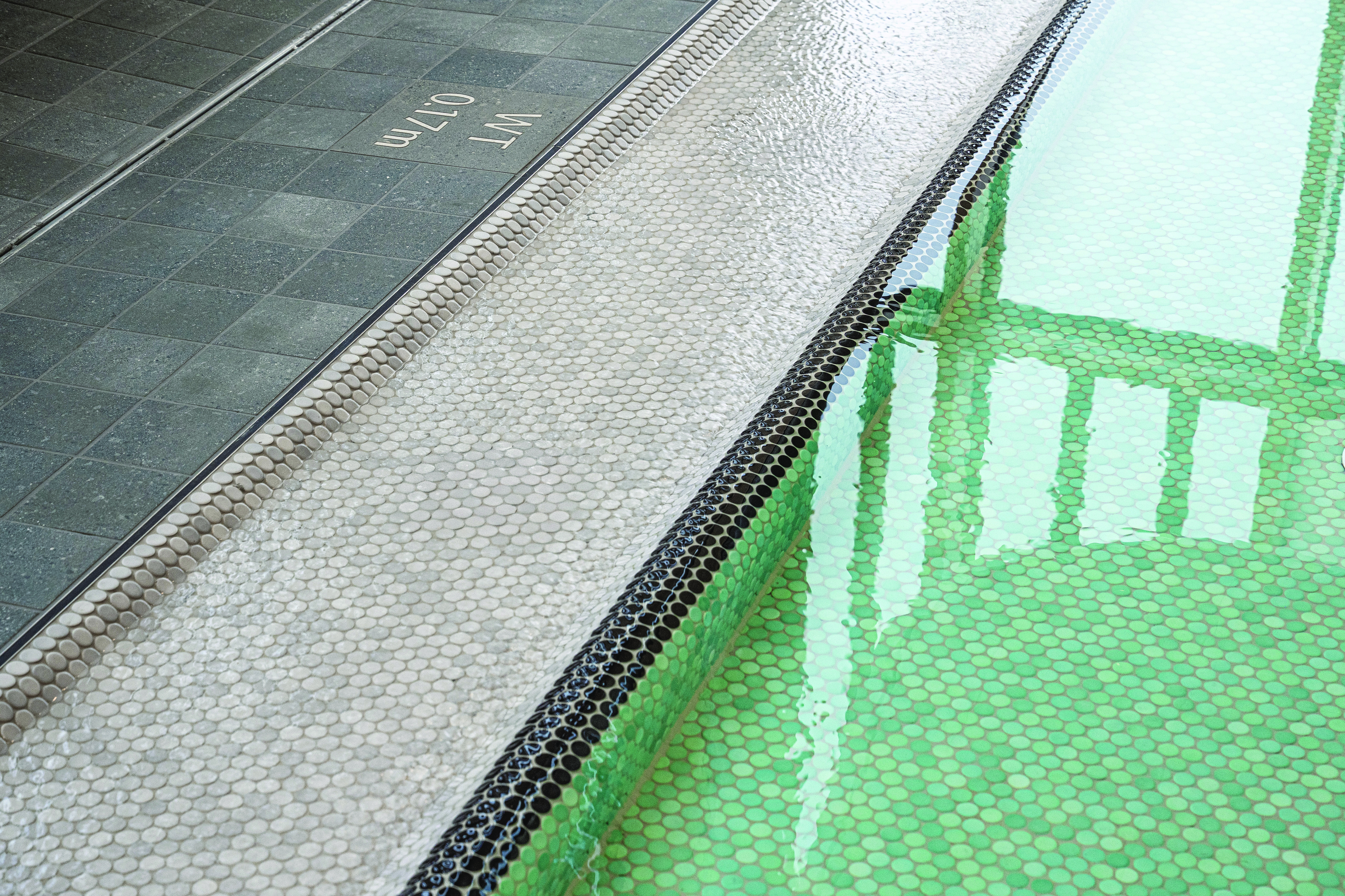The children’s pool also reflects the color palette of the water: Loop round mosaics in sea green and aqua blue create a fresh, lively yet harmonious color scheme. In the relaxation areas, this palette is complemented by lighter, mineral-inspired shades. Benches clad in the Loop round mosaic in ivory echo the chalky tones of the rock and glacial formations of the Allgäu landscape, forming a natural contrast to the dark flooring.